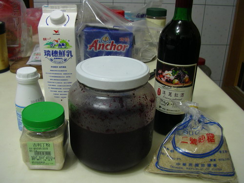 - 桑椹醬+吉利丁液拌勻,若溫度太低吉利丁拌不勻的話可隔水加熱。冷卻後加入葡萄酒拌勻,因溫度太高酒精會揮發。